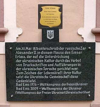 The secret decree of Ems Ukaz, issued by Russian Tsar Alexander II in the German city of Bad Ems, was aimed at stopping the printing and distribution of Ukrainian-language publications in the Russian Empire.